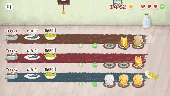 Don't miss to feed your pets For each pet you should give theire special meal. for Cat - fish for Dog - meat for Rabbit - carrot Don't forget, the Rabbit like to fall
